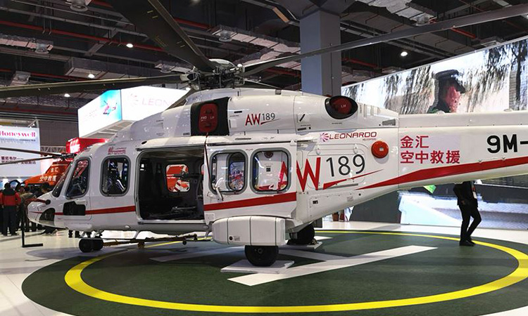 意大利莱奥纳多AW189直升飞机:最新的高性能超中型双发直升机,最大起飞重量8.6吨,配有两台带有FADEC的GE CT7-2E1大功率涡轴发动机。客舱最多可搭乘20人,满载最大巡航速度287公里每小时,最大燃油量超过2吨,最大航程超1000公里。